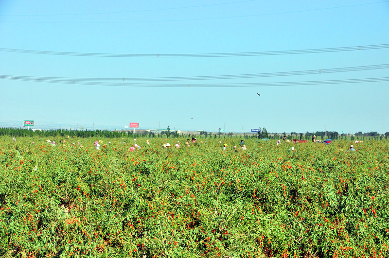 眼下正值枸杞抢收季节,宁夏同心县河西镇同德村润德庄园7500亩有机枸杞迎来丰收季。