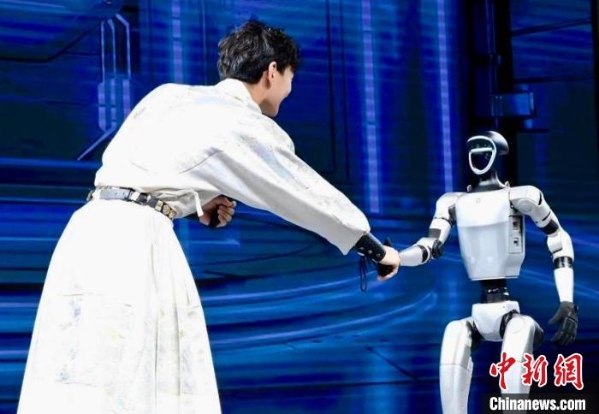 在长安云·西安科技馆举行的开营仪式上,身着唐服的海外科技青年与设计流畅、动作精准的智能机器人并肩而立,伴随着融合现代电子节拍的音乐,一场精心编排的“人机共舞”翩然开启。
