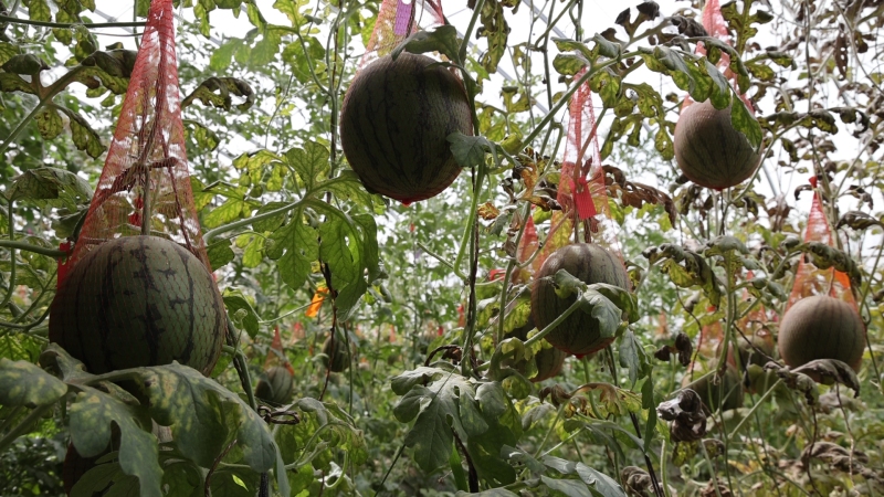 “这种‘吊’着长的小兰西瓜具有抗病性强、早熟、耐裂、丰产、甜度高、口感好等诸多优点。与常见的露地西瓜相比,由于是立体种植,它适合高密度栽培。”姜小花说,今年种植了5棚小兰西瓜,从5月上市之初就受到市场的青睐,目前已经销售了3棚,按照平均每个售价20元,目前销售额7万元。