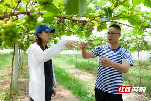 眼下,正是葡萄成熟的季节。在蒸湘区雨母山镇新竹村华农葡萄农民专业合作社,陈俐正在基地细致察看今年的葡萄长势,她一边用手轻轻托起葡萄串,一边耐心讲解:“采摘前10天要减少灌溉,让土壤含水量保持在 60% 左右,这样葡萄甜度能提高2-3个糖度。”作为葡萄基地的“技术管家”,她坚持从品种筛选、精准施肥、病虫害绿色防控、科学修剪到采摘全过程指导。