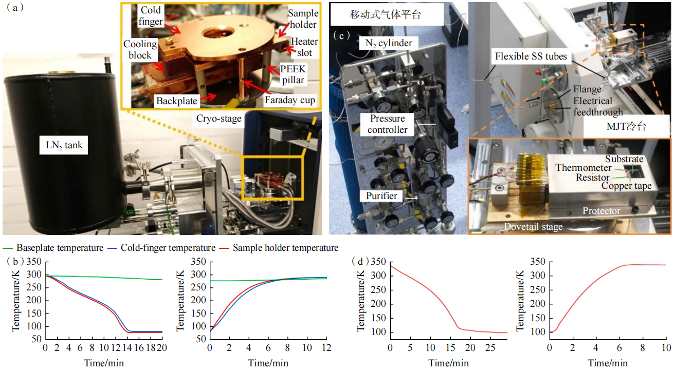 与此同时,冰刻系统的低温制冷模块也不断推陈出新。2022年,丹麦技术大学团队研制的冰刻冷台通过嵌入式的流道设计使液氮直接流经样品台周围,可以在20 min内使样品温度降至78.8 K并能在15 min内升至室温,如图7(a)、(b)所示。2024年,西湖大学团队报道了微机械焦耳−汤姆逊(MJT)低温平台,如图7(c)、(d)所示,该平台不仅能够以极低的氮气损耗完成高效的降温(30 min内降至99.5 K,10 min内升至室温),同时其机械振动幅值仅有5.6 nm。