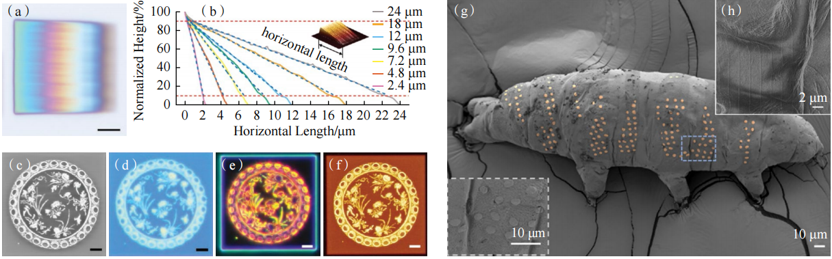 冰刻工艺流程的生物友好性展现了其在生物材料中应用的潜力。西湖大学团队利用冰刻技术在水熊虫表面直接制造微纳米尺度的图案,最小线宽低至72 nm,如图10(g)、(h)所示。在加工完成之后,水熊虫可以重新恢复活力,身上的图案也成功保留下来。该成果为兼容活体生物的微纳器件制造提供了解决方案。