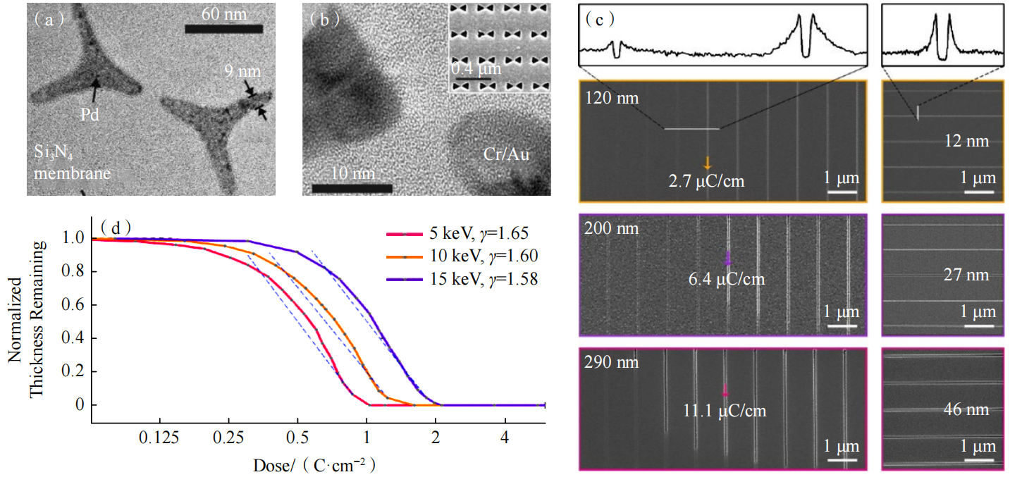 基于电子束曝光的加工方式决定了冰刻和EBL具有相近的加工精度(特征尺寸)。除此之外,冰胶材料的选取(分子质量)、冰胶的厚度、电子束的加速电压、束流大小等参数也会对冰刻加工的最小线宽造成影响。在冰刻正胶加工方面,图4(a)和(b)分别展示了冰刻在Si3N4薄膜表面制作出9 nm金属线宽和7 nm结构间距。如前文所述,冰胶厚度同特征尺寸直接相关,图4(c)展示了不同水冰厚度下的冰刻特征尺寸,图4(d)中的曲线显示了正性冰胶水冰的对比度曲线。
