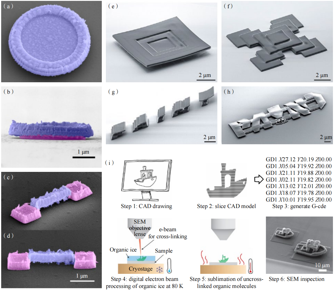 前文介绍了冰刻技术具有原位观察和对准的优势,利用这一优势可以实现金字塔状、蘑菇状、桥状等多种三维金属结构的制备(图2(e)和图8(a)~(d))。除此之外,基于有机冰胶苯甲醚同样可以进行多次冰胶覆盖和逐层曝光,无须金属沉积的步骤,即可加工出多种三维的碳质结构,如图8(e)~(h) 所示。图8(i)展示的是丹麦技术大学的研究人员利用有机冰胶壬烷,结合工业3D打印的建模和加工方式,实现了像素大小为550 nm、层数多达500层的复杂结构的3D打印。