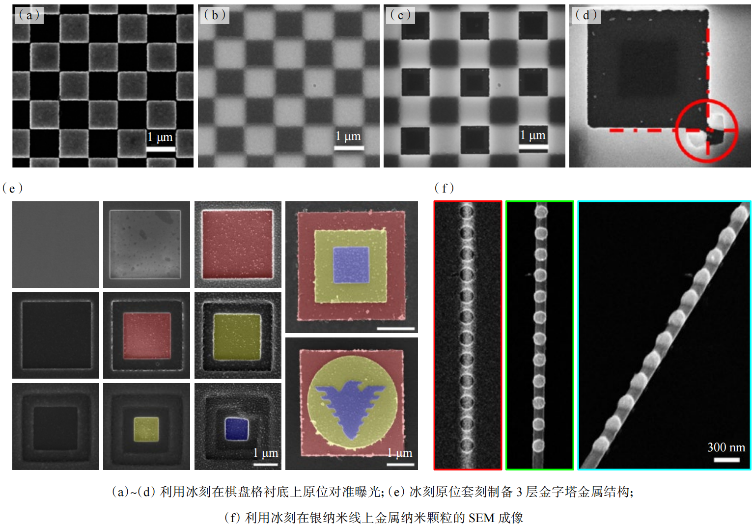 冰刻的第1项优势是可以实现原位的观察和对准。得益于水冰在电子束加工中的低灵敏度,在加工过程中可以利用冰刻系统本身的扫描电子显微镜(SEM)直接观察冰胶下方的纳米结构。冰刻技术的这一特点使多层结构加工中利用原位SEM观察来实现高精度对准套刻成为可能,而无需借助额外的对准标记和复杂的套刻流程。图2(e)和(f)的结果体现了这一优势。