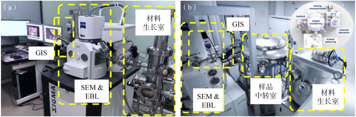 丹麦技术大学、浙江大学、西湖大学等团队各自研制了新型冰刻系统。由于未集成材料生长系统,丹麦技术大学的冰刻仪器专注于有机冰胶的纳米制造。相比之下,图6(a)展示的浙江大学研制的冰刻仪器支持多种金属薄膜沉积。图6(b)所示的西湖大学最新研发的冰刻系统,不仅配备了自动化的传样装置,实现高效率、多角度、多工位的样品传输,还可以进行金属、半导体、氧化物等多种材料的沉积,是当前最先进的冰刻系统。