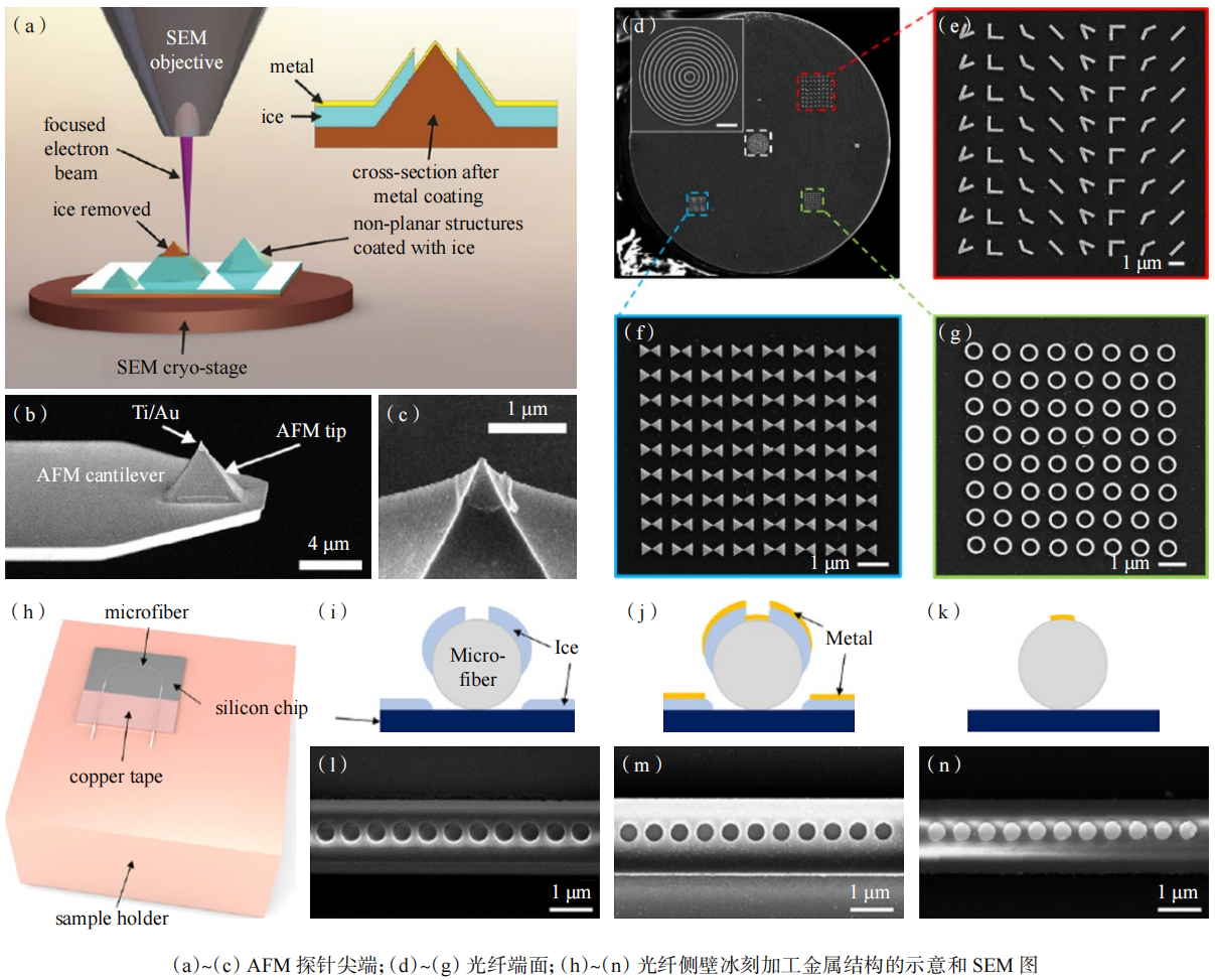 冰刻的第2项优势是能够在非平面和不规则表面进行加工。冰胶能够在自由曲面衬底上均匀凝结覆盖,进而实现非平面衬底上的电子束加工。这一特性在图3中得到了充分展示:图3(a)~(c)展示了微纳探针尖端进行冰刻加工的流程;图3(d)~(g)和图3(h)~(n)是在光纤的端面和侧壁上利用冰刻加工出的多种金属结构阵列。
