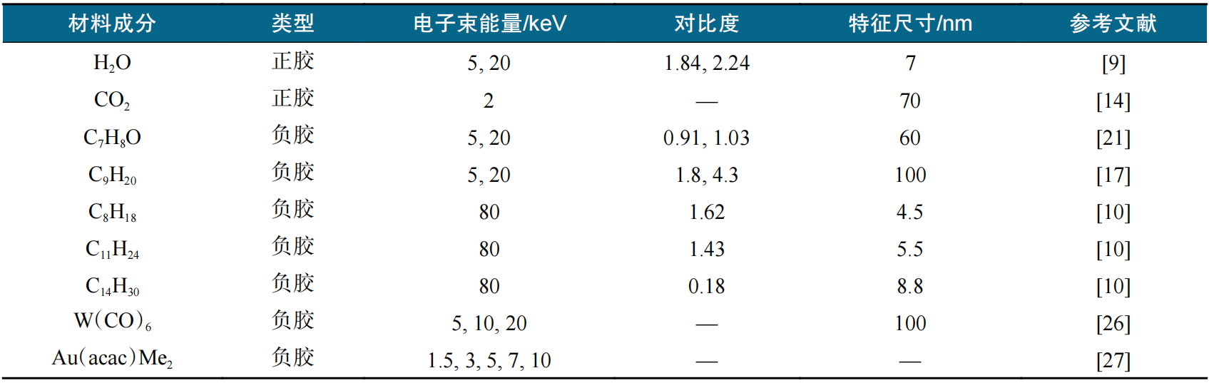 目前已证实的冰胶材料种类较少。其中,仅水冰和干冰(固态CO2)2种材料能够作为正性冰胶,而由简单有机分子(如醇类、烷烃等)形成的有机冰往往表现出负性冰胶的性质。表1总结了目前报道的主要冰胶材料及其基本的冰刻加工参数。