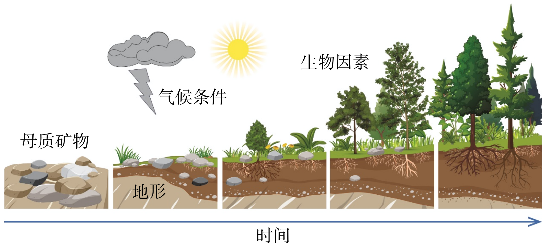 尾矿成土生态工程的理论基础是土壤发生学。土壤发生过程(图4)是指成土母质在一系列物理、化学、生物作用下发生矿物风化和次生矿物形成、有机质的生成和累积、土壤结构的形成和发展,以及各类生物的定殖居留,最终成为具有一定结构并支撑生态系统功能的土壤。影响土壤发生过程的主要因素包括母质类型、生物活动、气候条件、地形坡度和时间尺度。这5个因素共同决定土壤发生的速率和最终形成的土壤类型。