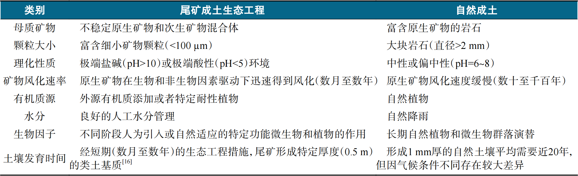 尾矿成土生态工程旨在构建尾矿安全成土综合治理技术体系,其核心在于通过有效的生态工程措施促进尾矿矿物风化、结构形成和理化性质改善,最终将尾矿堆积区改造成为具有一定物理结构和生态功能的稳定无害的类土基质,实现可持续的尾矿生态重建。尾矿成土生态工程虽然效法自然土壤发生过程,但其与自然成土过程有着多方面的区别(表2)。