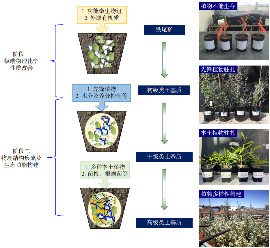 通过野外调查可以发现,一些耐性先锋植物和微生物能够驻扎在磁铁矿尾矿上,而这些关键功能微生物及先锋植物作为重要的“驱动者”驱动铁尾矿成土过程的进行。基于此,建立了两阶段生态工程成土策略(图7)。