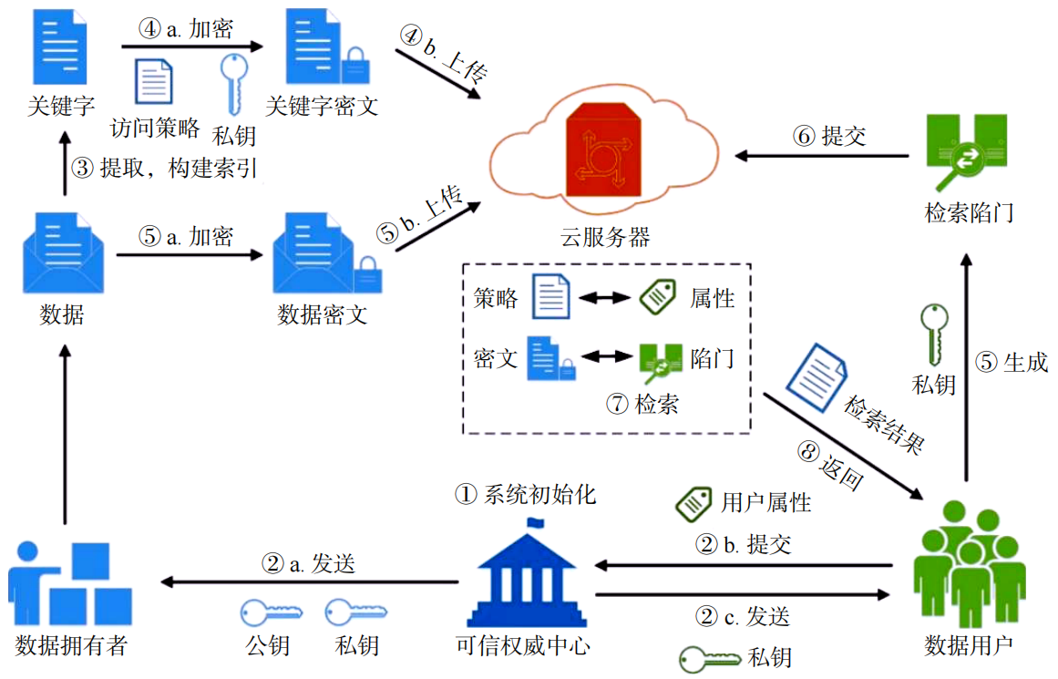 3)数据用户:数据用户选取待检索关键字,通过私钥为其生成检索陷门,提交给云服务器。