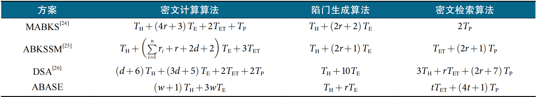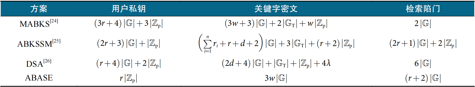 提出的ABASE方案和其他3个方案的理论存储开销对比如表2所示,可见,ABASE在用户私钥的存储开销显著低于其他3个方案。