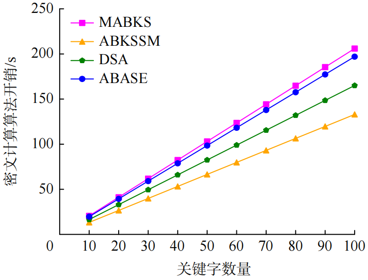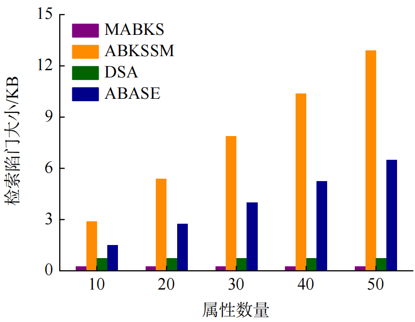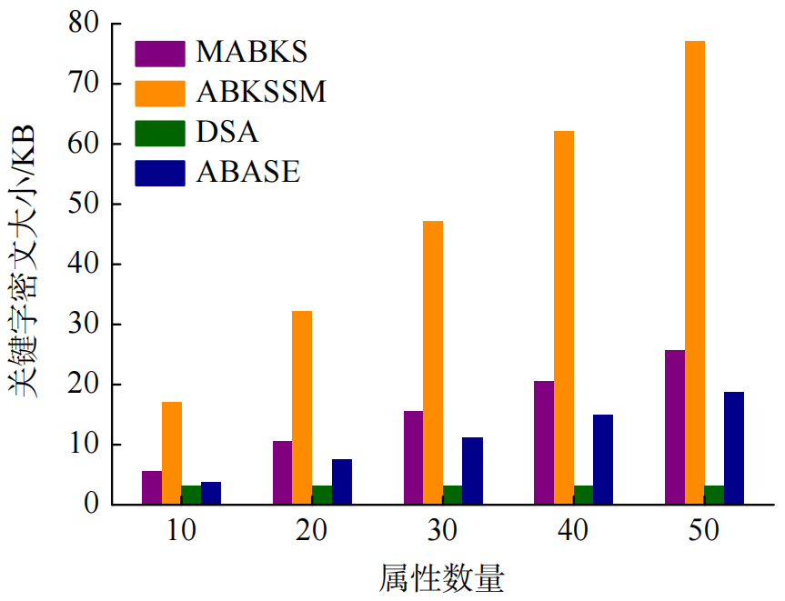 图6展示了4个方案的关键字密文大小,可见DSA的密文大小与属性数量无关,ABASE的密文大小随着属性数量的增加而线性增大,显著低于MABKS和ABKSSM方案的开销。