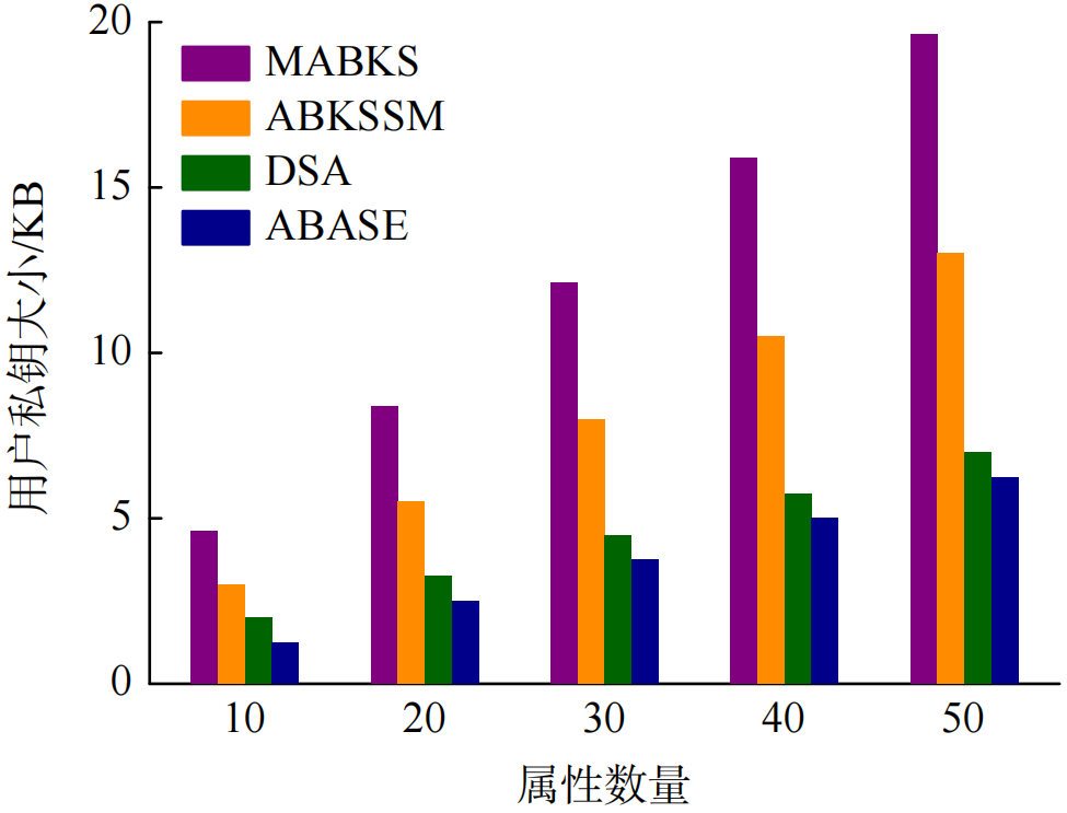 对于方案的通信开销对比,如图5所示,相对于MABKS、ABKSSM和DSA,ABASE在用户私钥的通信开销方面具有显著的优势,从而印证了表2中所得到的结论。