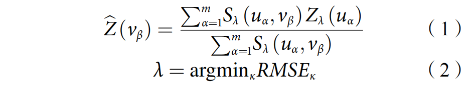 (3)基于最优相似性阈值,计算未知位置与已知观测位置之间地理配置的相似度,通过加权平均的方法根据相似度进行空间预测,见式(1),其中λ计算方法见式(2)。
