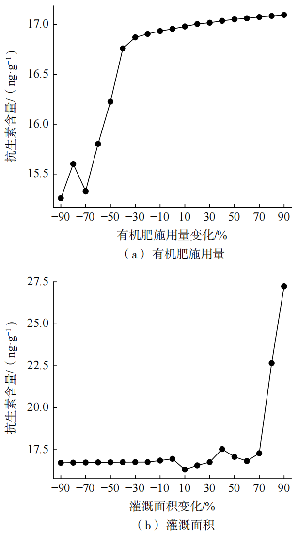情景分析模拟结果显示,随着有机肥施用量和灌溉面积的变化,土壤抗生素含量的均值表现出显著的阈值效应(图6)。在有机肥施用量变化的情景中,当有机肥施用量增加时,抗生素含量逐渐上升,当有机肥施用量减少超过40%时,抗生素含量迅速下降,显示出强烈的阈值效应,表明合理减少有机肥使用可以有效控制土壤抗生素污染。在灌溉面积变化的情景中,土壤抗生素含量的变化趋势与有机肥施用量不同。结果表明,当农田管理强度超出一定的阈值时,尤其是在过度施肥和灌溉时,土壤抗生素污染将急剧增加,强调了合理控制农田管理措施的重要性。