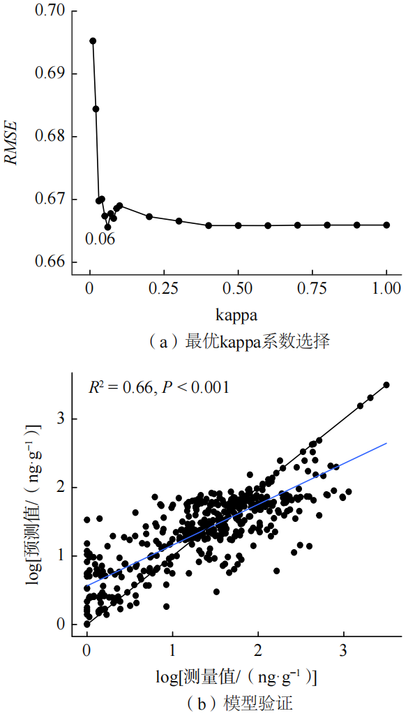通过调整kappa值(κ)来优化GOS模型的性能。随着κ值的增大,模型的均方根误差(RMSE)逐渐减小,当κ=0.06时,RMSE达到了最低值(图3),表明与未知位点相似性较高的6%的样本被用于模型预测,且该κ值能够最有效地减少模型误差,提升预测精度,表明GOS模型在土壤抗生素污染的空间预测中具有较好的模拟效果和较高的预测准确性。