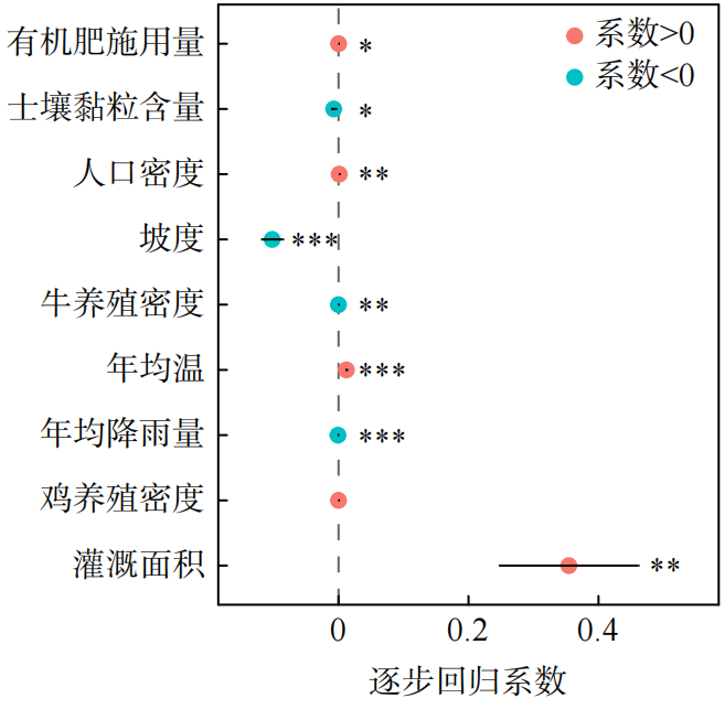 通过逐步回归模型分析了不同因素对土壤抗生素空间分布的回归系数及其显著性,通过回归系数,可以明确每个因素对土壤抗生素含量的影响程度,其显著性通过p值来评估,其中p值小于0.05的因素被认为对土壤抗生素污染具有显著影响。此外,通过预测值和观测值的回归R2值来评估模型的预测准确性。