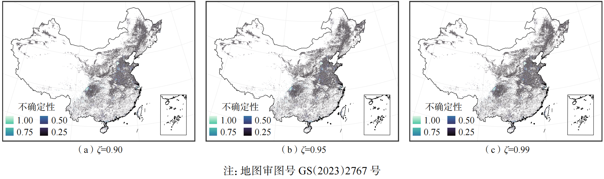 在GOS模型的不确定性分析中,随着ζ值的增加,预测结果的不确定性逐渐降低(图5)。这表明,随着相似性阈值的增大,模型的预测结果变得更加精确,尤其在数据丰富和地理相似性较强的区域,预测结果的可靠性显著提高。