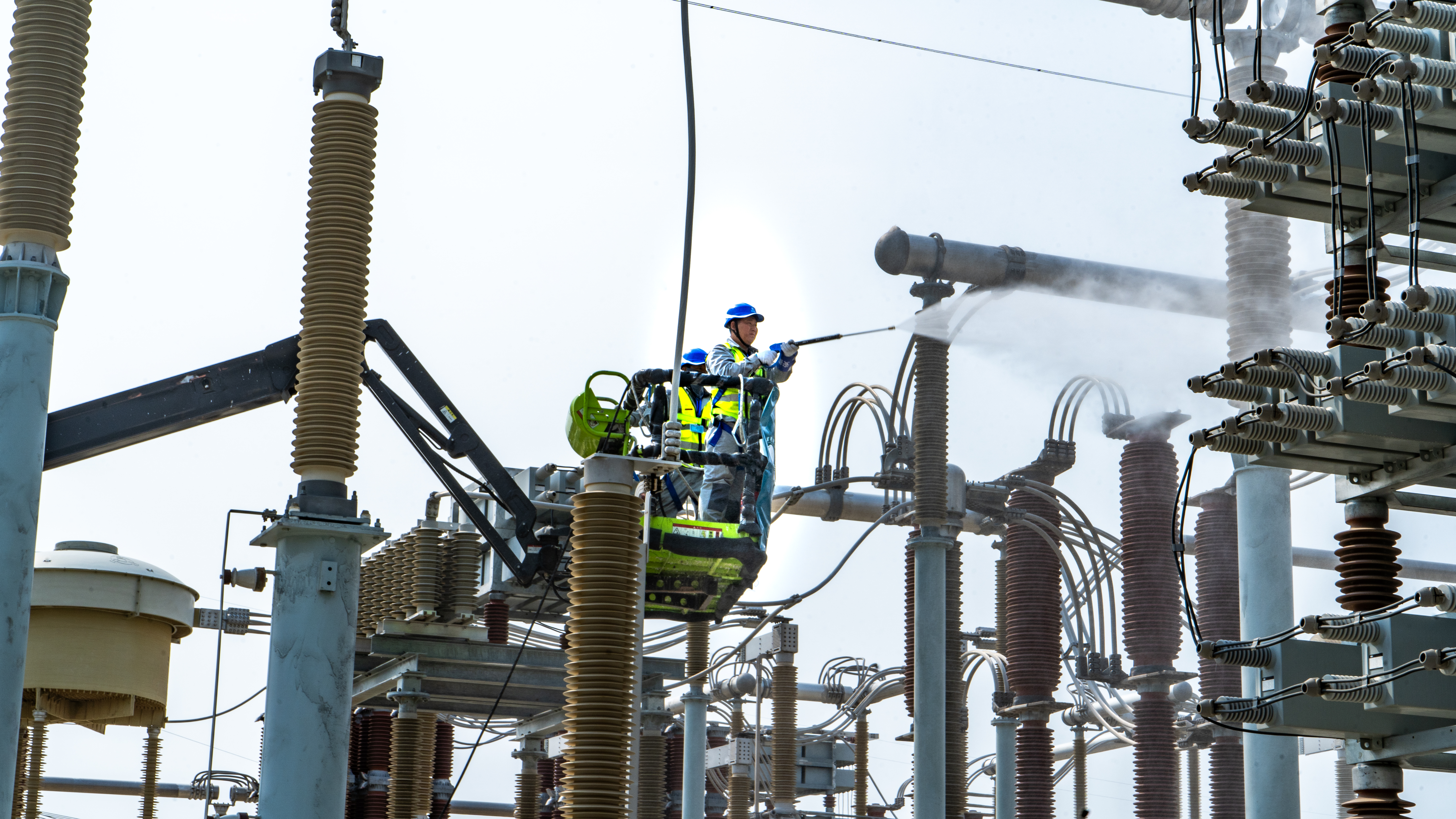 国网内蒙古超特高压公司检修人员正在对直流场支柱绝缘子伞裙进行清理。马超 摄