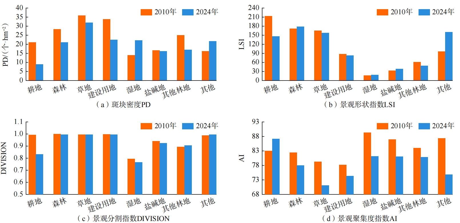 通过Landsat 8遥感影像获取了察汗淖尔流域2010年和2024年的土地利用数据,并分析了各土地利用类型在该时间段内的变化。在此基础上,计算了2期的斑块密度、景观形状指数、景观分离度指数、景观聚集度指数,从景观格局角度分析评价了察汗淖尔流域的生态安全状况。结果表明,2010—2024年,流域内的盐碱地面积显著上升。从景观格局的角度分析,耕地和森林的景观破碎度下降较为显著,而湿地的景观破碎度急剧增加。总体来说,察汗淖尔土地覆被转类指数和土地覆被综合变化率分别为47.36%和20.54%,表明土地覆被类型仍然在向较好的方向转变。