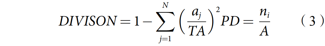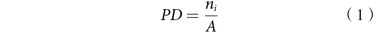 1)斑块密度。揭示出景观基质被类型斑块分割的程度,对生物保护、物质和能量分布具有重要影响。PD值愈大,破碎化程度愈高,计算公式为