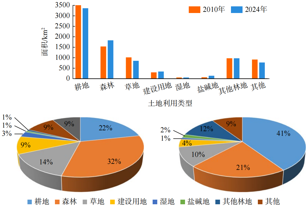 图3显示了各土地利用类型的变化趋势,耕地面积呈现下降趋势,从2010年的3001.78 km2下降到2024年的2876. 35 km2;森林面积呈现上涨的趋势,从2010年的1324.73 km2增加到2024年的1576.37 km2。草地面积呈现下降趋势;盐碱地面积上升。此外,建设用地面积有所增加。