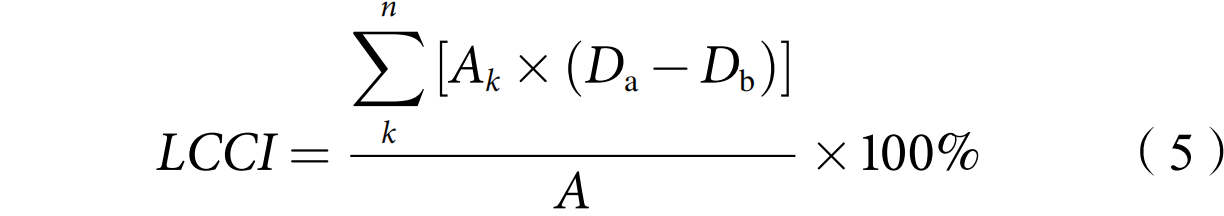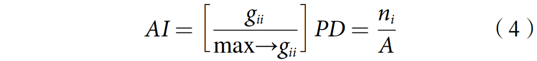 4)景观聚集度指数。景观聚集度指数基于同类型斑块像元间公共边界长度来计算。当某类型中所有像元间不存在公共边界时,该类型的聚合程度最低;当类型中所有像元间存在的公共边界达到最大值时,具有最大的聚合指数。计算公式为