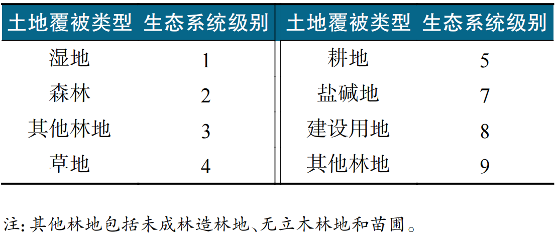 生态系统类型相互转化强度反映研究区生态系统类型在一定时段内变化的总体趋势,通过土地覆被转类指数来衡量。我们的研究按照该流域生态服务功能强度对土地利用类型进行生态系统级别的划分,具体如表1所示。在对生态系统类型定级后,将生态系统类型变化前后的生态级别相减,结果为正值表示研究区生态系统类型构成状况及宏观生态状况总体上转好,值越大,说明转好程度越高;反之表示转差,且绝对值越大,说明转差程度越大。