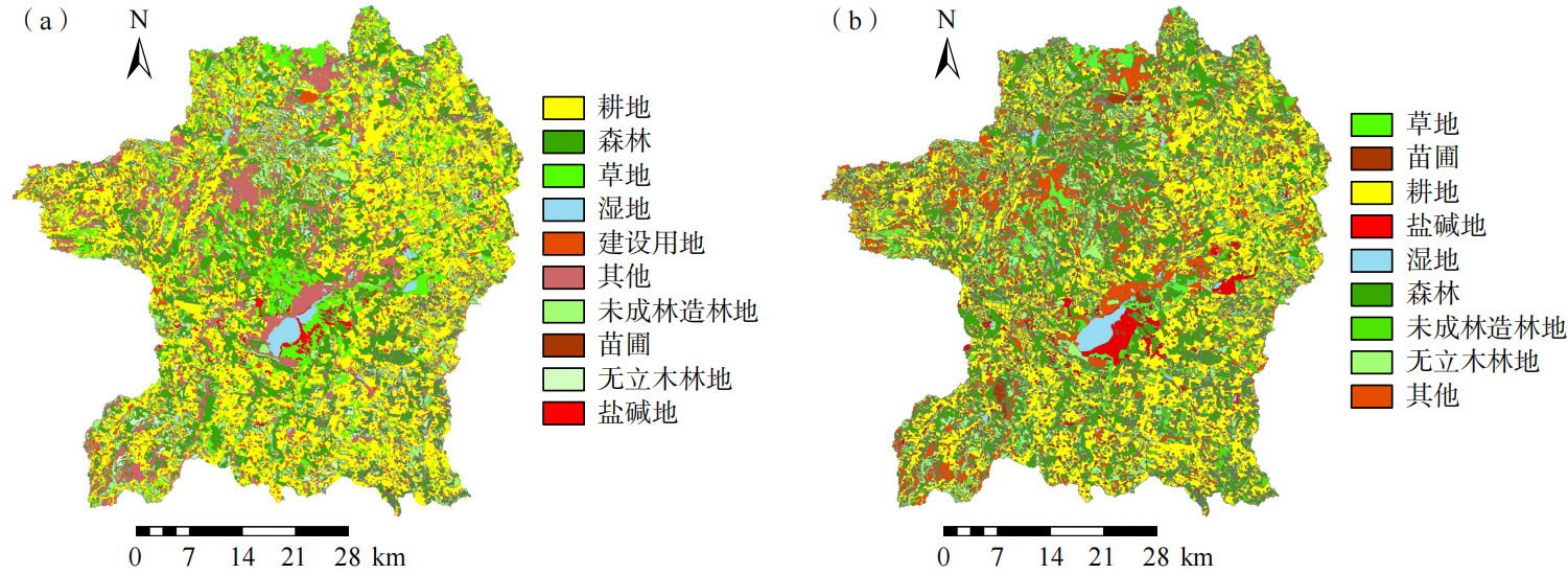 利用监督分类得到的两期土地利用结果如图2所示。从土地利用分布图可以看出,察汗淖尔流域的耕地所占面积最大,其次为森林和草地,然后依次为无立木林地、未成林造林地、建设用地、盐碱地、湿地,苗圃所占面积最小。