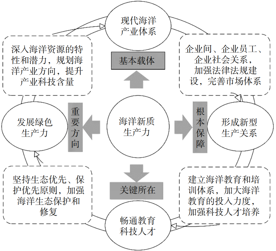 完善现代海洋产业体系、发展绿色生产力、形成新型生产关系、畅通教育科技人才的良性循环是海洋新质生产力的4个重要发力点(图9)。