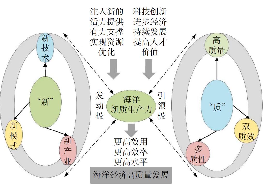 海洋新质生产力,新是其发展的原动力“发动极”,不断推动生产力的解放与发展,并为其注入新的活力。同时,质是其引领的方向“引领极”,通过不断拓展人类效用的边界和丰富社会福利的内涵,降低对海洋环境的压力,实现海洋经济的可持续发展,促进生产力体系向更高质量、更高效率和更高水平迈进(图7)。