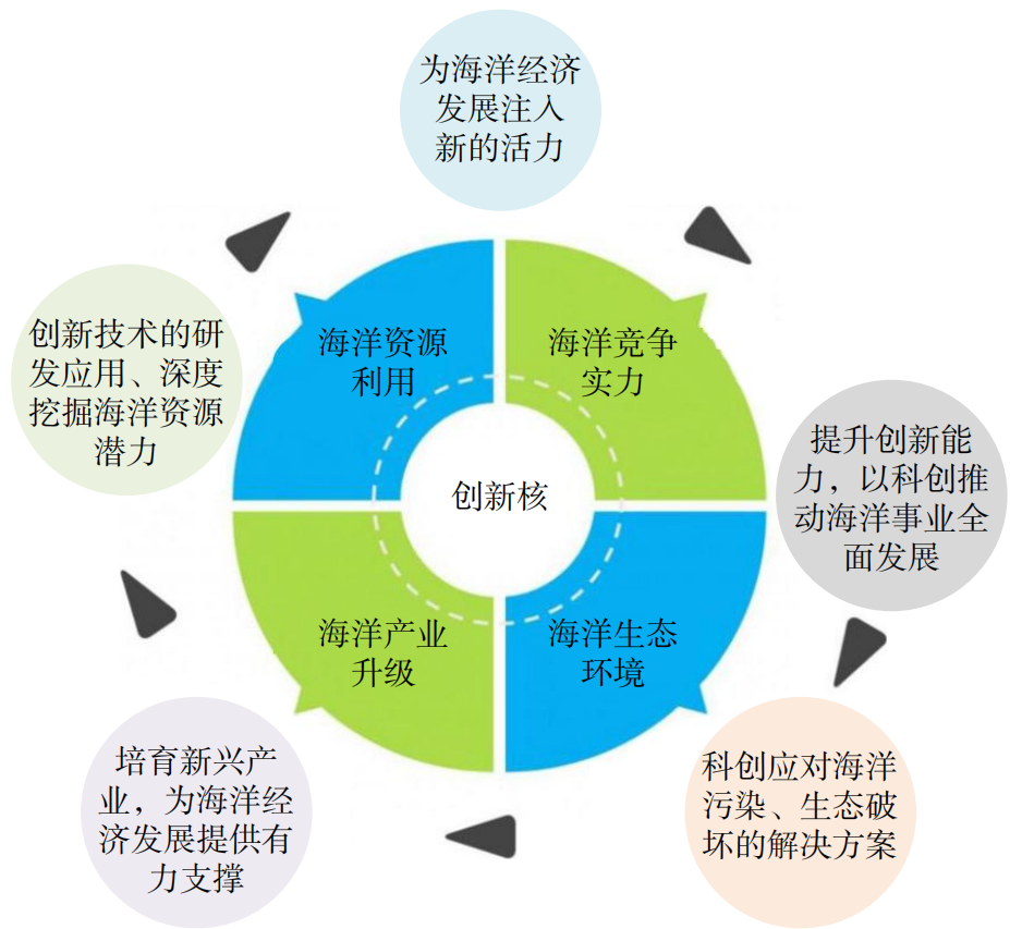 海洋科技创新是推动海洋新质生产力发展的强大引擎,也是引领海洋经济腾飞的先导力量。海洋科技创新的重要性,不仅在其催生新产业、新模式、新动能,更在于其对于提升海洋资源利用效率、保护海洋生态环境、增强国家海洋竞争力等方面具有深远影响(图6)。