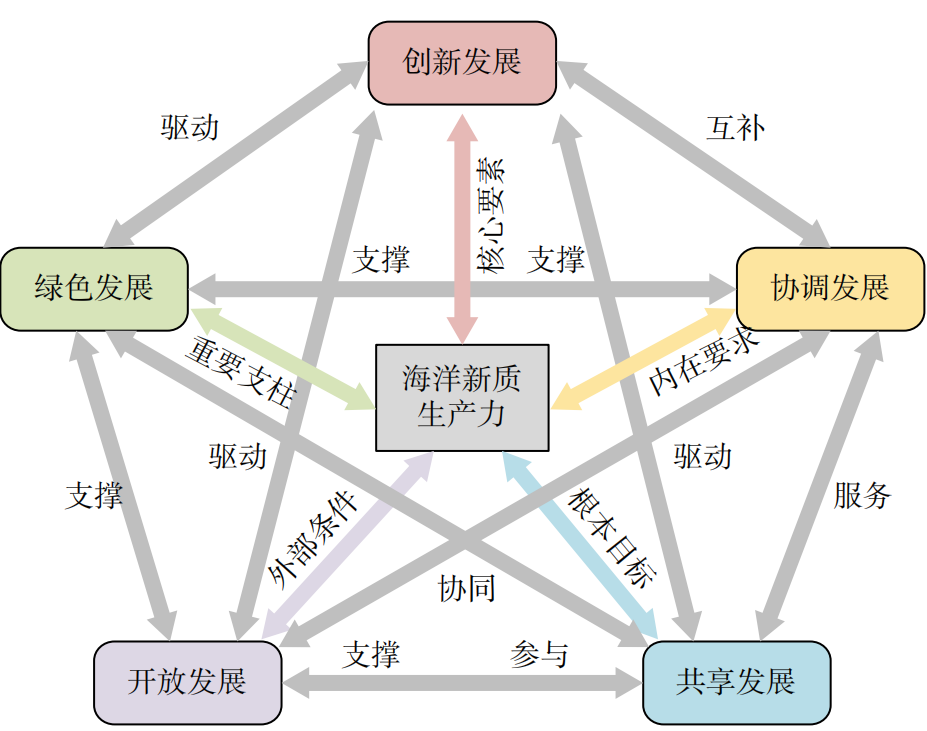 新发展理念是一个系统的理论体系,回答了关于发展的目的、动力、方式、路径等一系列理论和实践问题,在推动实现海洋新质生产力的过程中,也应该符合“创新、协调、绿色、开放、共享”的新发展理念(图10)。