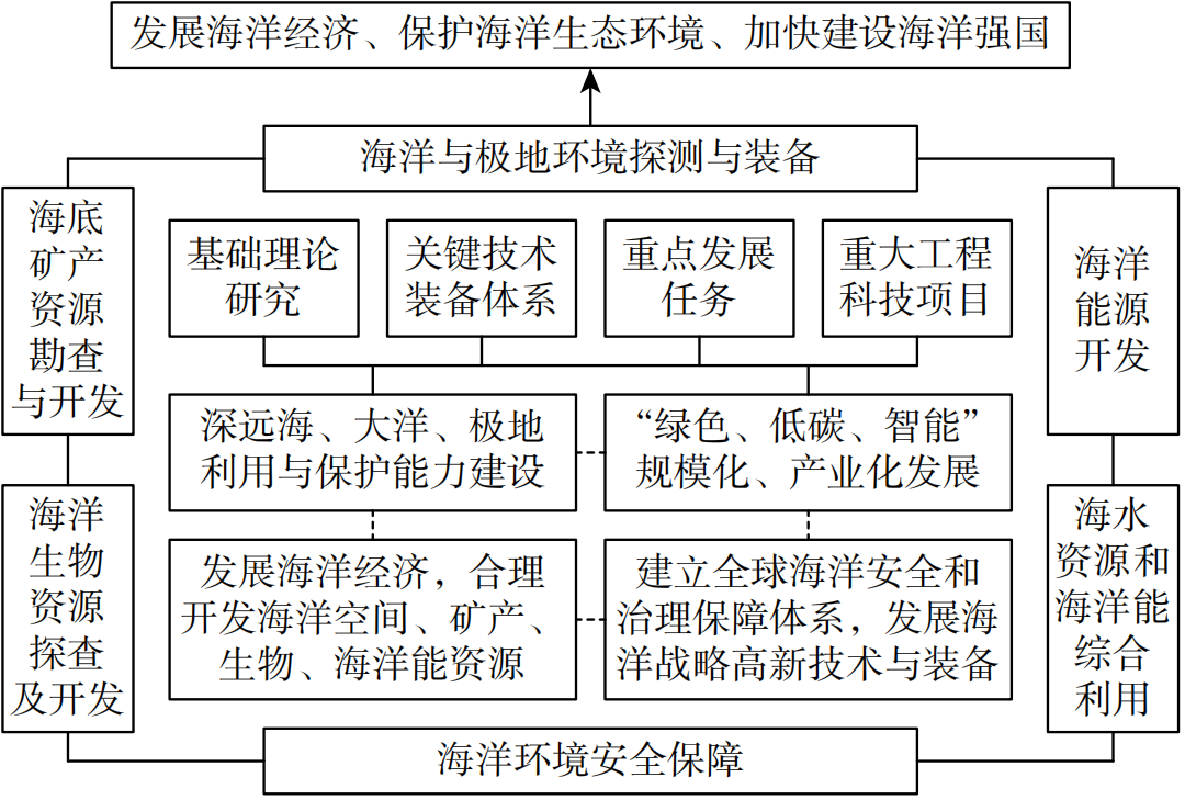 中国需要在发展海洋工程科技的同时,以“发展海洋经济、保护海洋生态环境、加快建设海洋强国”的战略目标为指引,紧密围绕建设美丽中国、推动海洋经济高质量发展、保障能源资源安全、拓展生存与发展空间及捍卫国家海洋权益等战略需求,加大技术攻关力度,显著提升自主创新能力,以技术创新带动海洋装备和产业升级,抢占海洋领域未来发展高地。以支撑海洋强国建设作为战略目标,重点发展海洋能源开发、海洋与极地环境探测与装备、海底矿产资源勘查及开发、海洋生物资源探查及开发、海水资源和海洋能综合利用、海洋环境安全保障6个子领域的重大关键技术,加强深远海、大洋、极地利用和保护能力建设,推动“绿色”“低碳”“智能”规模化、产业化发展,提升海洋战略高新技术与装备水平,建立全球海洋安全和治理保障体系,以推动整个海洋产业健康、快速发展。
