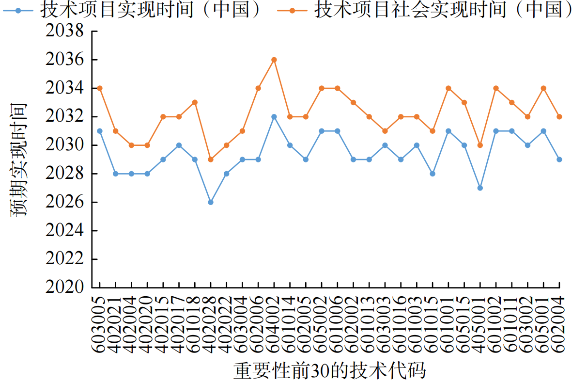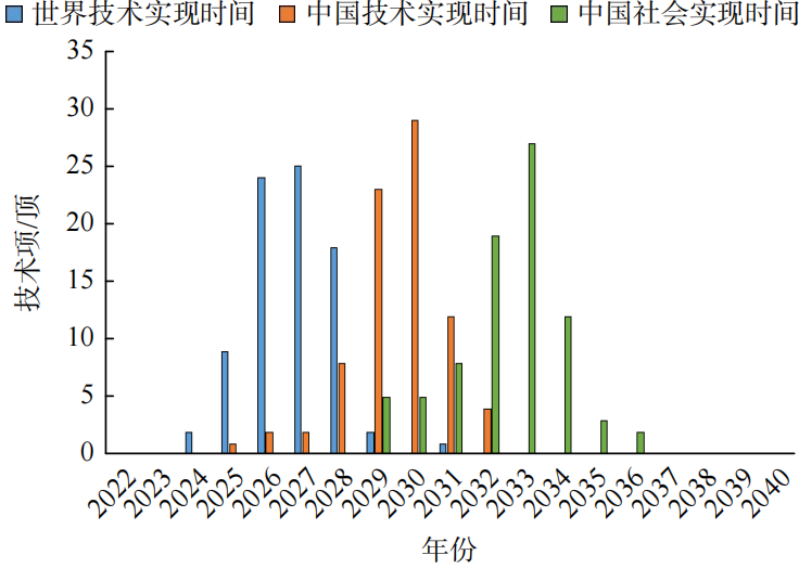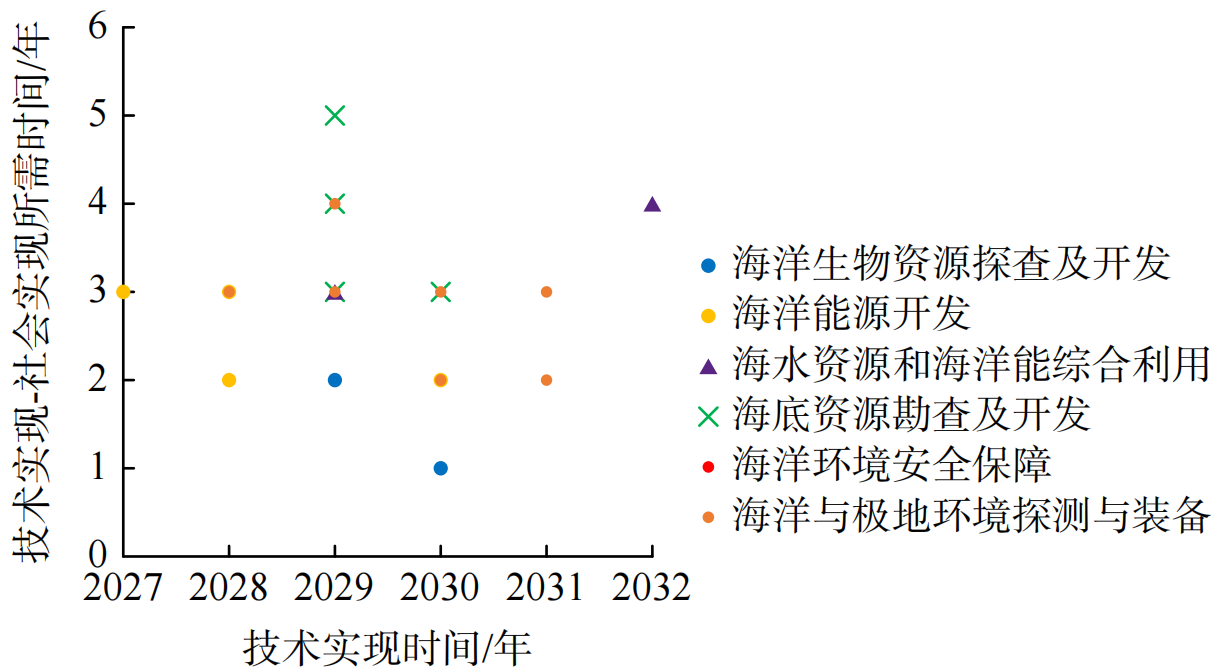 主要分析海洋科学技术的世界范围内技术实现时间、中国范围内技术实现时间,以及中国范围内的社会实现时间等(图1),所有技术项的预期世界技术实现时间为2024—2031年,预期中国技术实现时间为2025—2032年,预期中国社会实现时间为2029—2036年。