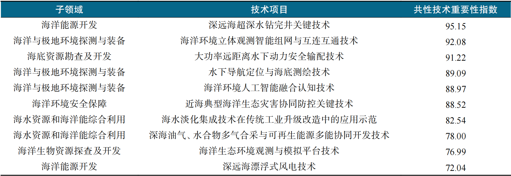 表3 海洋领域关键共性技术方向