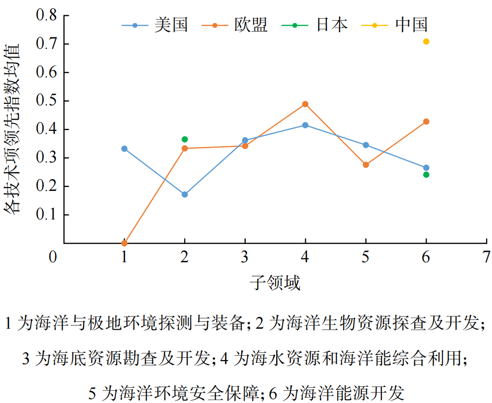 通过分析技术领先国家和地区分布可知(图4),美国在海洋与极地环境探测与装备、海底资源勘查及开发和海洋环境安全保障子领域拥有技术优势,欧盟在海水资源和海洋能综合利用子领域优势明显,日本在海洋生物资源探查及开发子领域具有优势,而中国在海洋能源开发子领域优势明显。