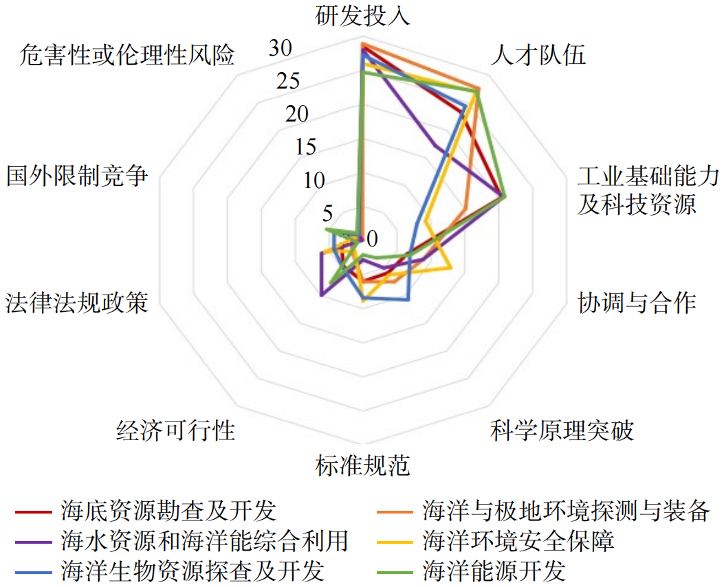 在技术预见中,针对每个技术项,设置工业基础能力及科技资源、人才队伍、研发投入、协调与合作、标准规范、法律法规政策、科学原理突破、经济可行性、危害性或伦理性风险、国外限制竞争等选项,结合专家熟悉程度,计算每个因素对技术项的制约程度。整体来看,当前研发投入和人才队伍是中国海洋工程科技发展的主要制约因素(图5),危害性或伦理性风险、国外限制竞争、法律法规政策等对海洋领域发展的制约性较小。