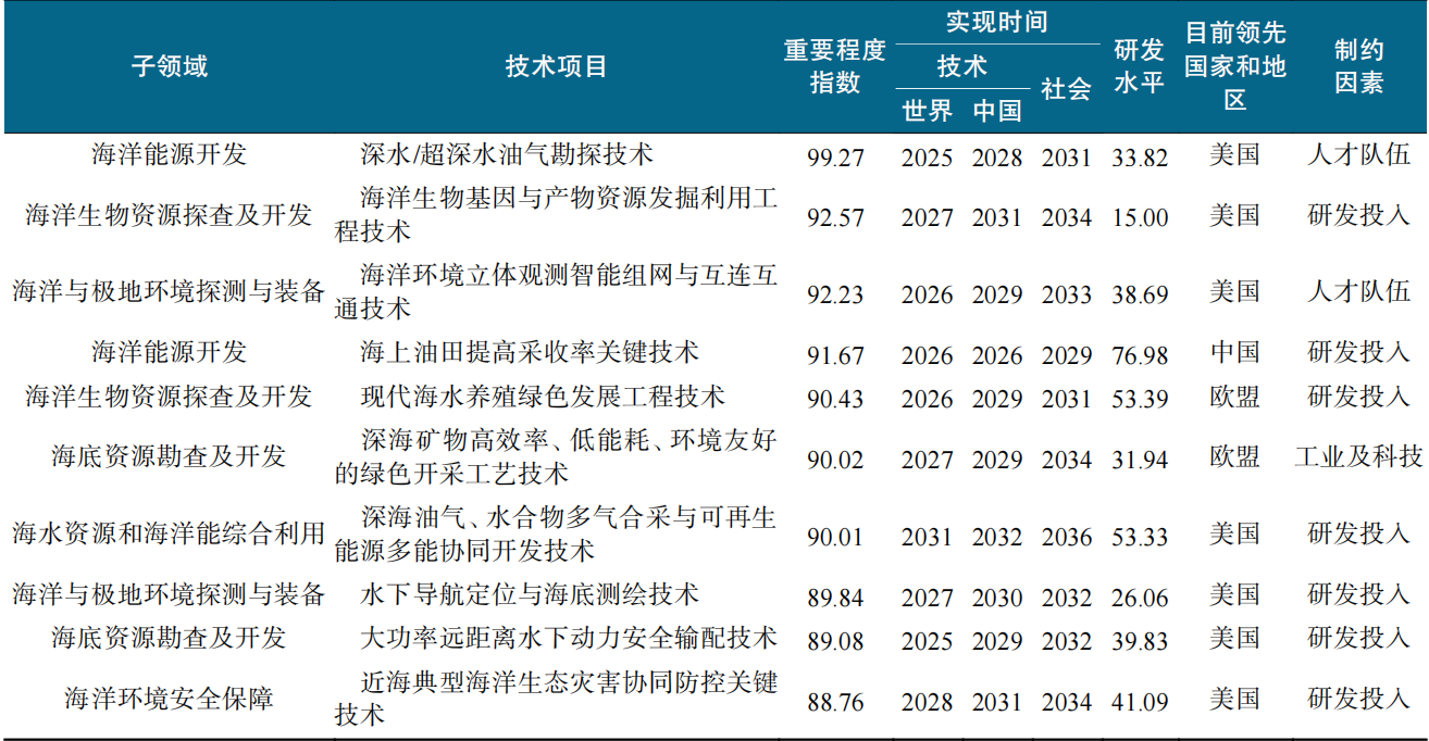 表2 海洋领域关键技术方向