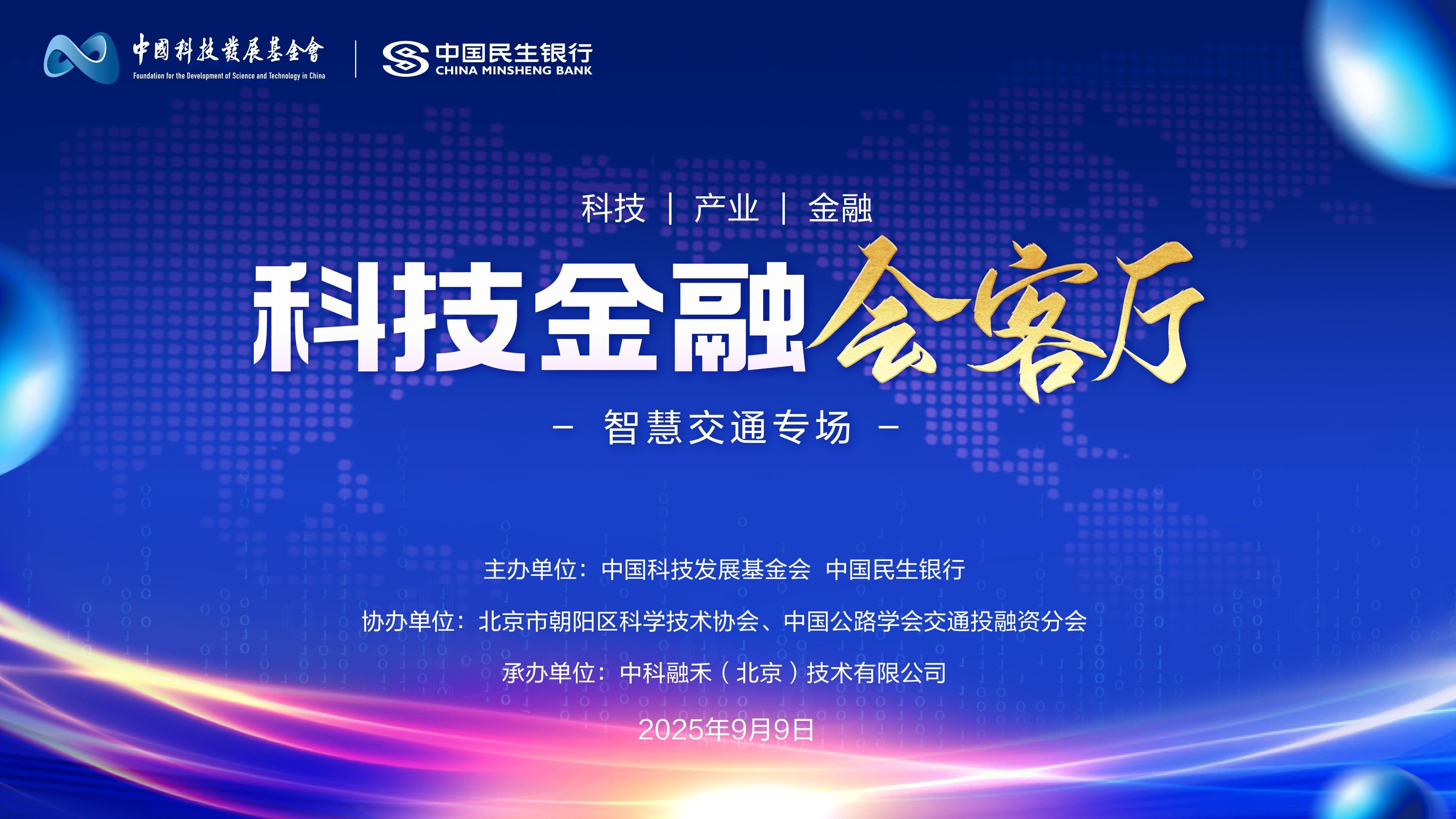 9月9日,一场聚焦智慧交通产业创新、加速产融深度融合的高端对话——“科技金融会客厅”智慧交通专场在京成功举行。本次活动由中国科技发展基金会与中国民生银行联合主办,北京市朝阳区科学技术协会和中国公路学会交通投融资分会支持,中科融禾(北京)技术有限公司承办,旨在通过公益赋能与产融协同,为我国智慧交通产业高质量发展注入强劲动能。