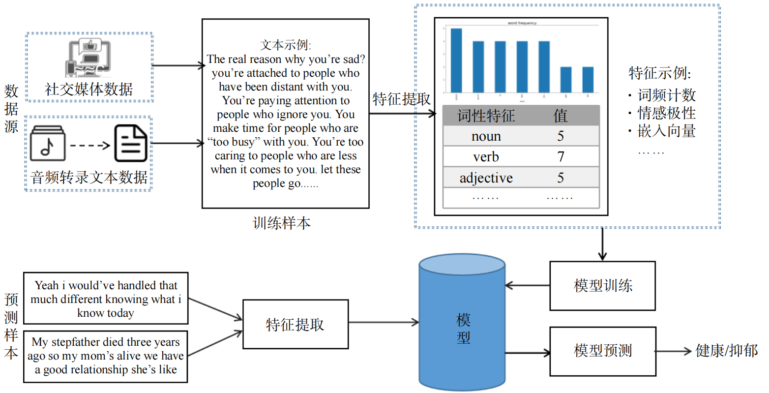 文本数据也是抑郁识别的重要模态之一,研究人员通常会收集社交媒体平台如Twitter、Facebook等用户发布的文本数据,通过自然语言处理和文本挖掘等技术挖掘数据中有关个体的健康状况、情绪状态等方面的信息,用于辅助评估抑郁的严重程度及潜在风险。然而,在许多国家和地区存在法律限制和隐私保密问题,诸多研究采用自行采集的文本数据集或从音频数据中转录得到文本数据。