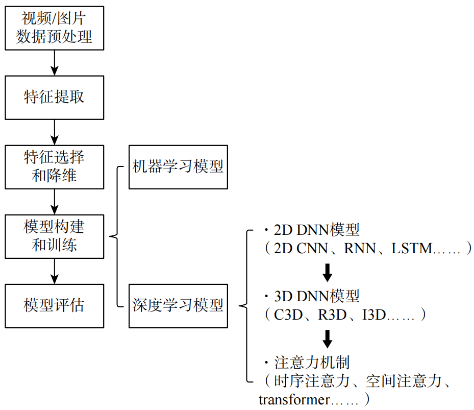 在抑郁识别领域,识别模型的迭代与深度学习的技术演化发展紧密相关。最初,应用2D CNN技术进行面部静态二维图像的分类和识别,虽然简单高效,但存在对时间序列信息处理不足的问题,对采集的视频数据无法很好挖掘帧与帧间的信息。3D CNN技术的引入扩展了模型对于动态视频数据的建模能力,更好地利用了时间维度的信息。随着注意力机制的广泛应用,有注意力的3D CNN框架进一步增强了模型对数据的理解和处理能力,为处理复杂数据的抑郁识别问题提供了更有效的工具和方法(图3)。这种演化从简单到复杂、从二维到三维、从静态到动态,提高了对于数据中关键特征的挖掘,并进一步提升了模型在准确率等方面的表现,对于抑郁识别问题的研究具有重要的意义和实际应用价值。