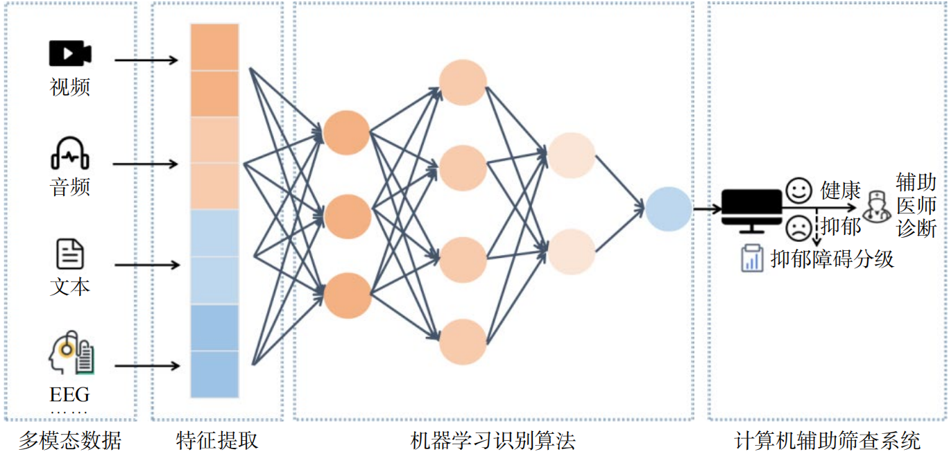 1)现有诊断方式依赖于患者对自我的合理评估,但由于心理测量中普遍存在的社会称许性等问题,患者对自己的评估往往倾向于偏离难以被社会接受的消极行为,偏向能够被社会认可的积极行为,导致心理测评的结果出现偏差。而计算机辅助筛查能够根据患者的面部行为、语言表达等数据,规范提取筛查指标、构建识别模型,结果相对客观准确,能够辅助医师进行抑郁症筛查。