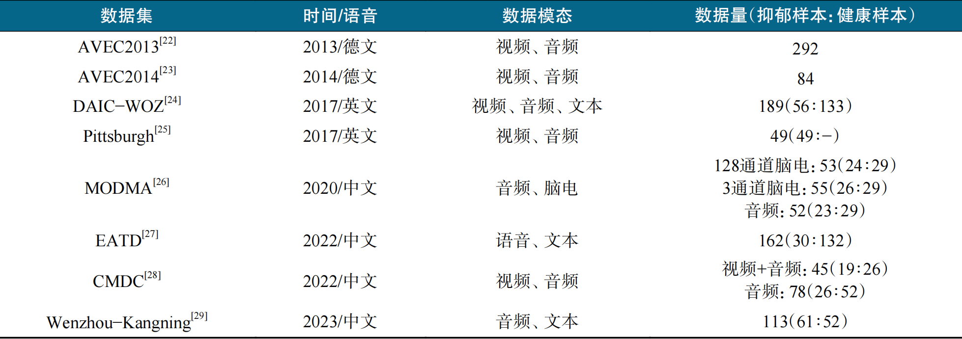 开源数据集为机器学习模型的训练提供了基础,推动了人工智能辅助筛查领域的发展,对抑郁识别领域的发展有明显的推动作用。数据集往往根据量表筛查或医师诊断出的抑郁人群或健康对照者给定标签,通过患者参与朗读、描述、访谈等实验采集视频、语音、脑电等多种数据模态。