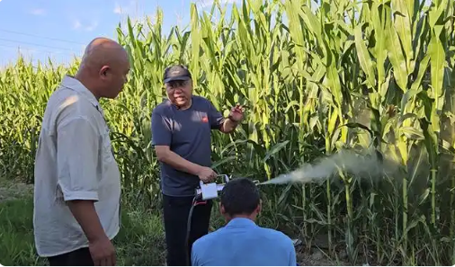 农技专家到田间指导玉米病虫害防治方法。包园园摄