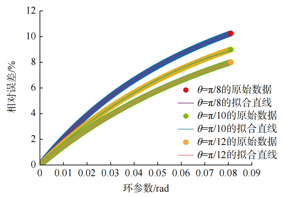 图6 θ为π/8、π/10和π/12时相对误差与环参数的二阶多项式拟合结果