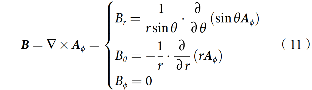 式中,Br、Bθ和Bϕ分别表示磁感应强度沿r、θ和ϕ方向的分量。