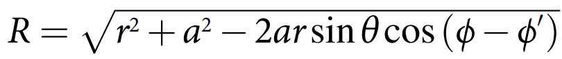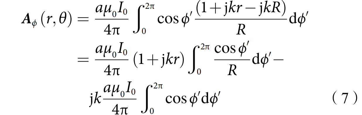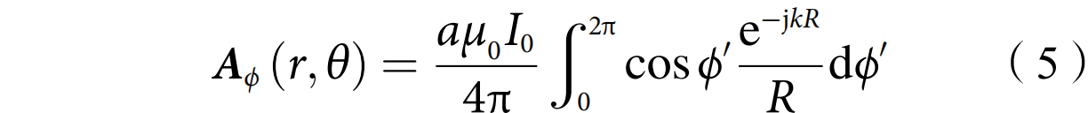 考虑到相位项对磁感应精度的影响较小,计算时取前2项作为近似值。以第3项作为近似误差项,把o(−j(k(R−r))2)表示的二阶高阶无穷小量舍去。由图1可知,R、r和a构成三角形的3条边,由几何关系可知|R−r|<a。在满足薄环形天线环参数限制条件下,对近似处理方式造成的误差很小,由此将相位近似结果代入式(5)可得